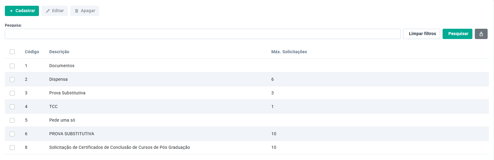 - Máximo Solicitações: Indica a quantidade máxima de vezes que um aluno pode solicitar um protocolo com essa categoria;