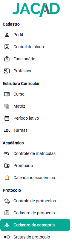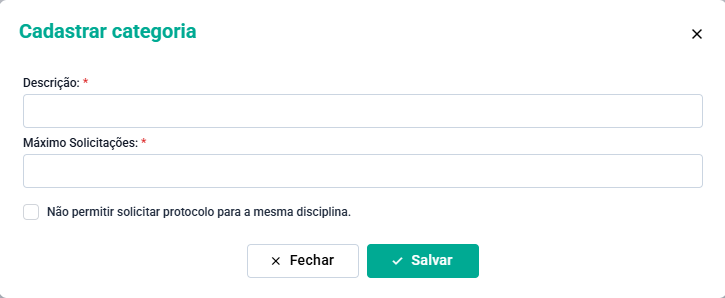A Categoria delimita funções e comportamentos do protocolo, em que estiver vinculada, como a quantidade máxima de solicitações que o aluno poderá fazer.