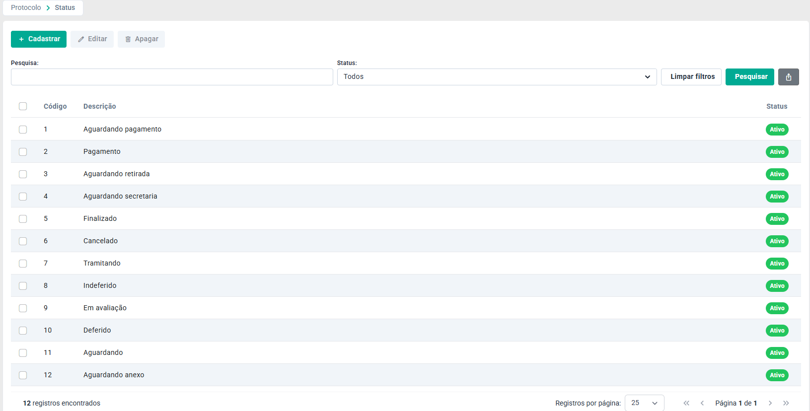 Na tela de Status de Protocolo, é possível gerenciar os diferentes status cadastrados no sistema por meio dos botões: