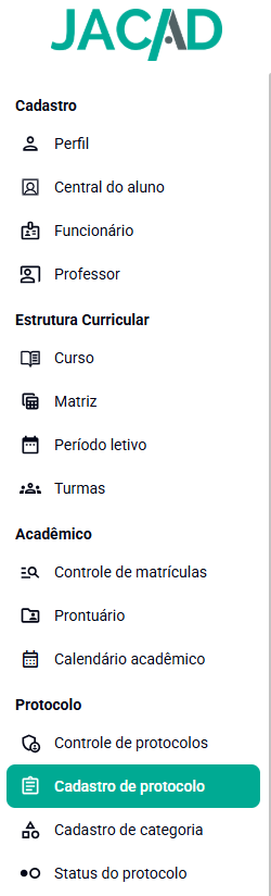 Acesse o menu Protocolo e clique em Cadastro de Categoria.