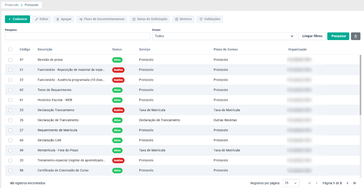 O Status do Protocolo é onde são cadastradas as diferentes situações pelas quais um protocolo pode passar na instituição. Por exemplo: Aguardando, Aguardando Pagamento, Cancelado e Concluído.