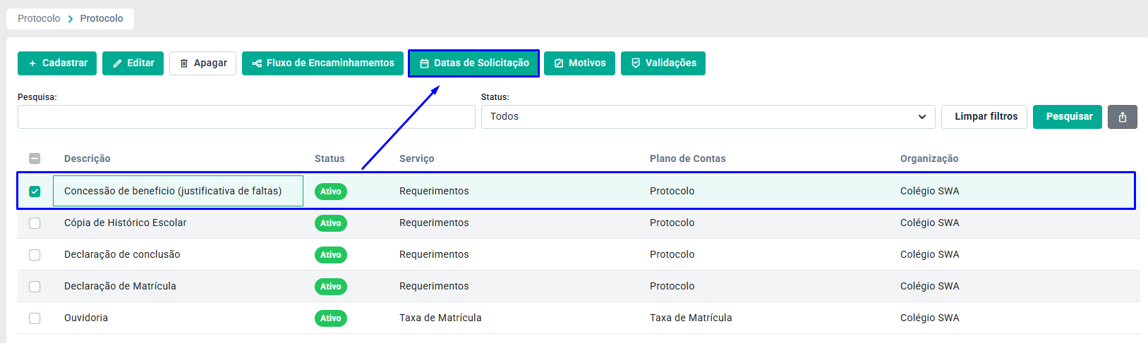 Para realizar o controle de datas para solicitações, e permitir que o protocolo selecionado seja solicitado dentro de um período cadastrado, selecione o protocolo desejado e clique em Datas da Solicitação.