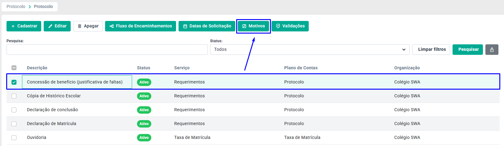 Para que seja possível realizar o cadastro de motivos para a solicitação de protocolo, você deve selecionar o protocolo desejado e clicar no botão Motivos.