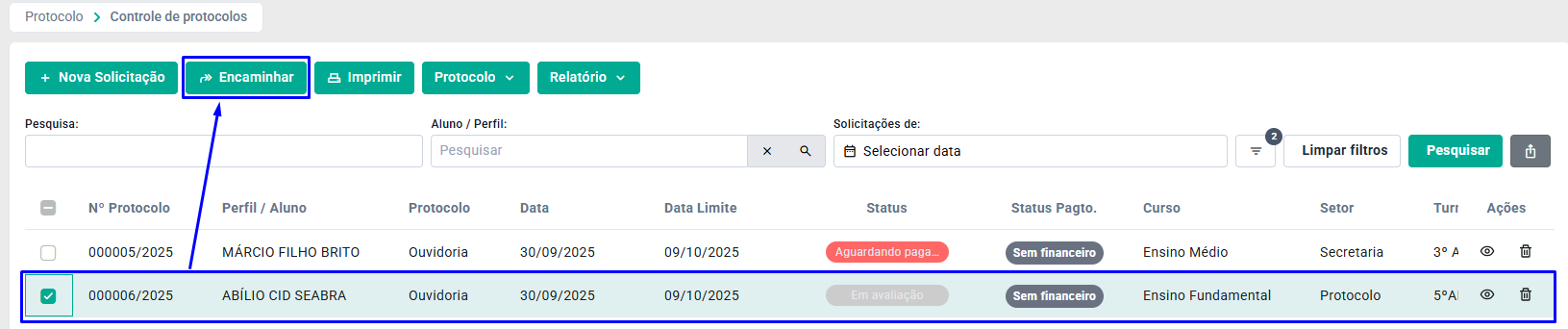 Na tela de Controle de Protocolos, selecione o Protocolo desejado e clique em Encaminhar.