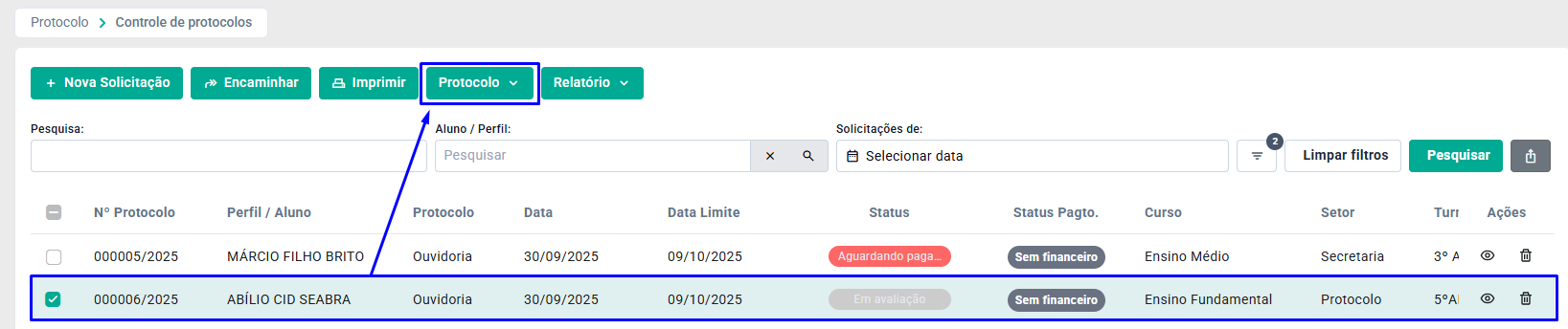 Na tela de Controle de Protocolo, selecione o protocolo desejado e clique em Protocolo.