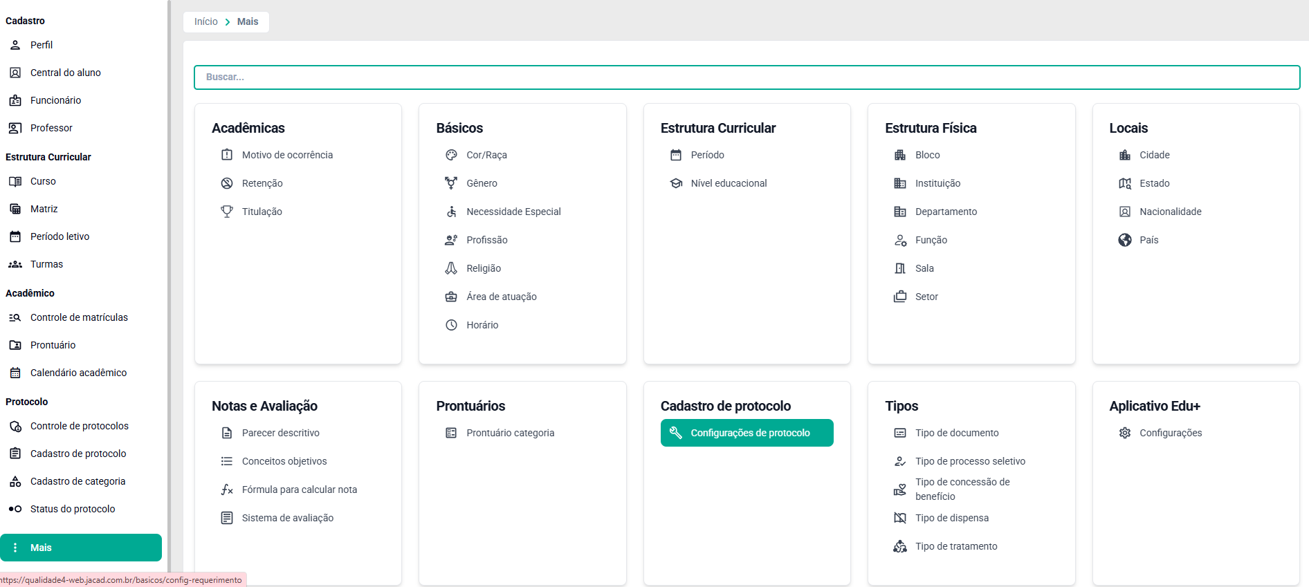 No menu Protocolo acesse a opção Mais, na sequência vá até o submenu Cadastro de Protocolo e clique em Configurações de Protocolo.