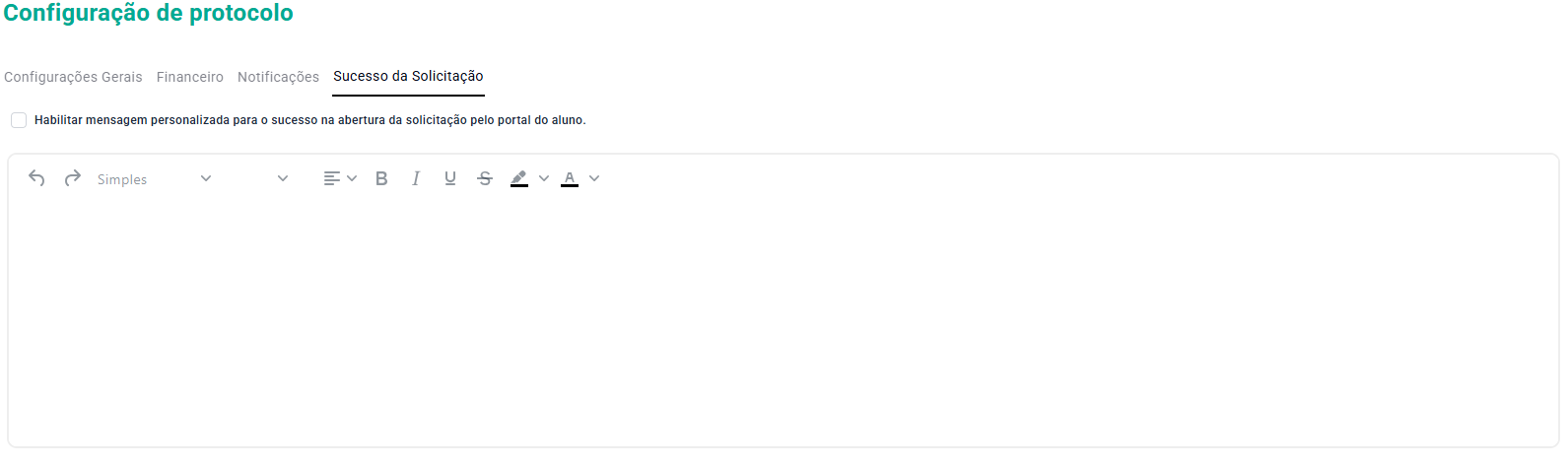 Na aba de Sucesso da Solicitação, podemos realizar a configuração de uma mensagem personalizada, que será apresentada quando o aluno realizar a abertura de uma solicitação pelo Portal do Aluno.