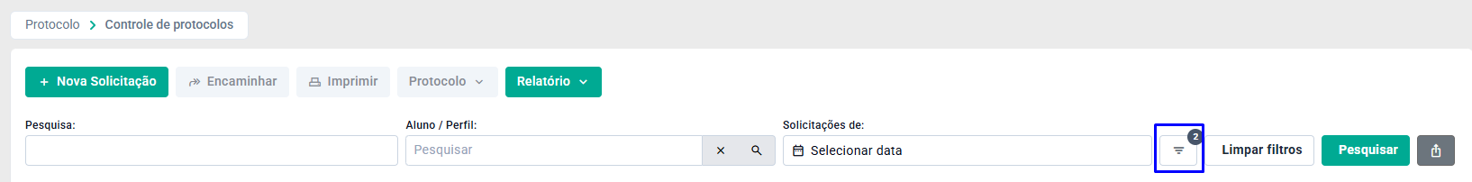 A tela de Controle de Protocolo é o local em que irá constar todos os protocolos recebidos dos alunos ou criados pela secretaria. É aqui onde você irá controlar e interagir nos protocolos, seja para deferir, enviar arquivos ou atender as solicitações dos alunos.