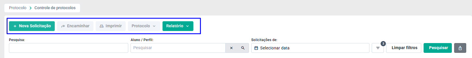 Na tela de Controle de Protocolos, o usuário tem acesso a diversos botões de ação que facilitam o gerenciamento das solicitações: