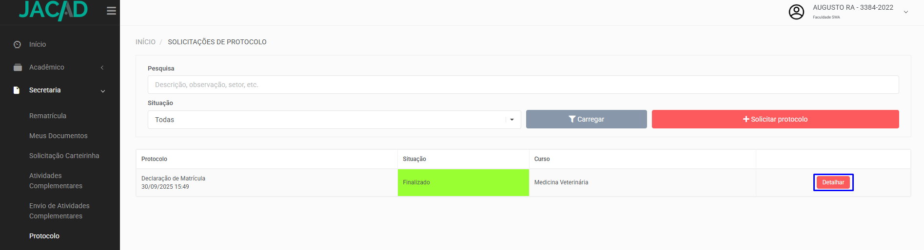 No Portal do Aluno, clique no menu Secretaria e clique em Protocolo, selecione o protocolo desejado e clique no botão Detalhar.