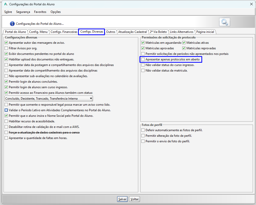 Acesse o Menu Preferências > Configurações > Portais > Portal do Aluno>clique na aba Configs. Diversas e desmarque a opção Apresentar apenas protocolos em aberto.