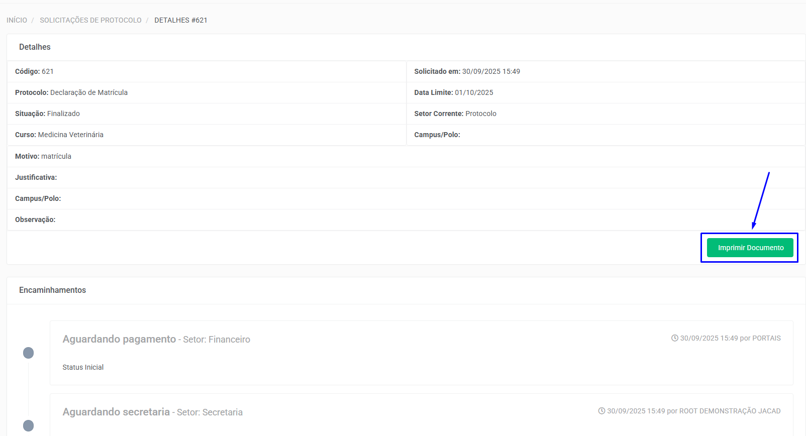 No entanto, se um protocolo com status finalizado não estiver aparecendo para o aluno após a solicitação:
