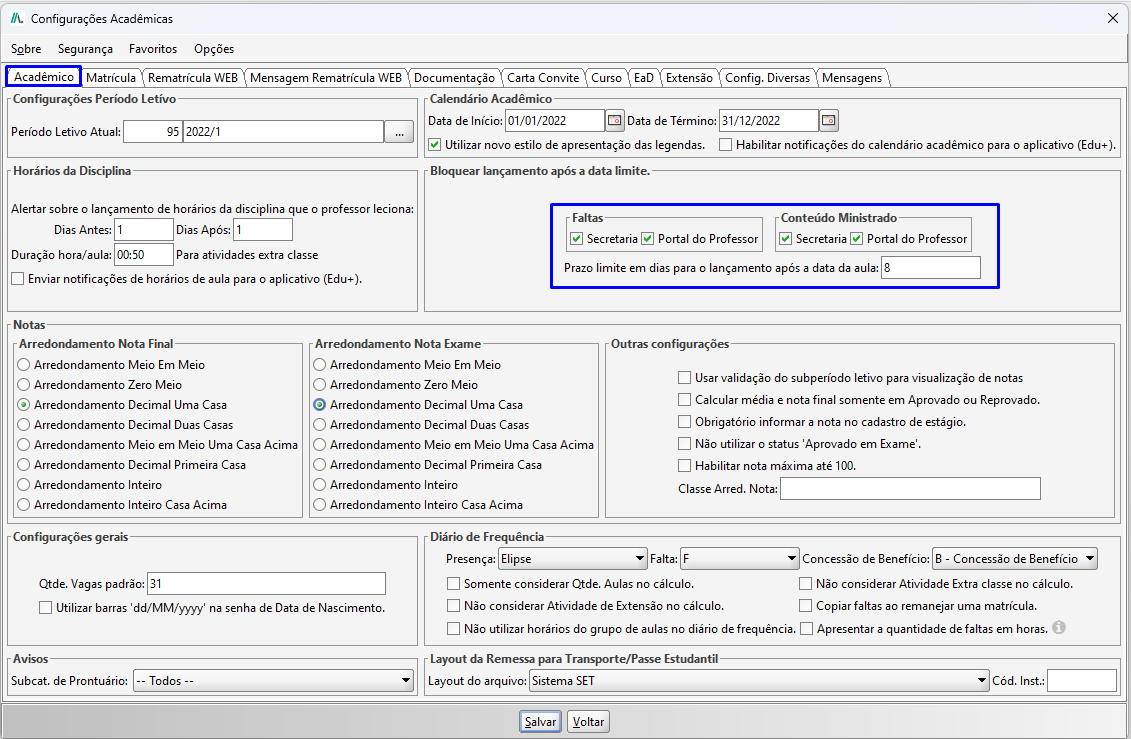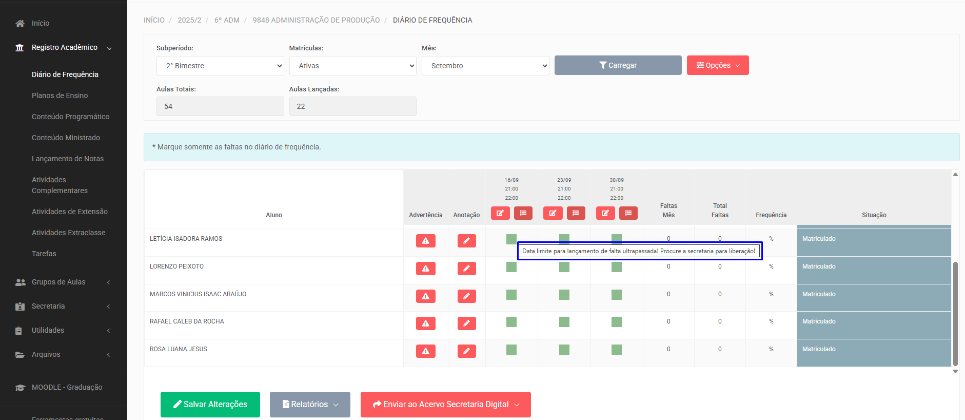 Após essa configuração, o sistema impedirá a inserção de faltas além do período estipulado.