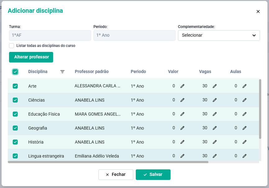 DICA: Nessa tela ainda é possível alterar o valor da disciplina, as vagas e a quantidade de aulas.
