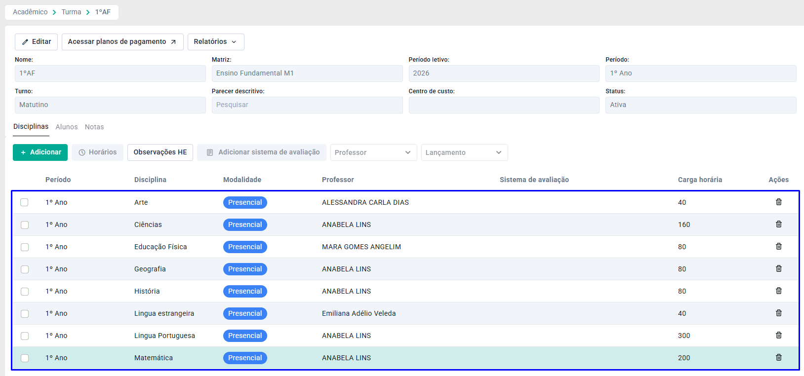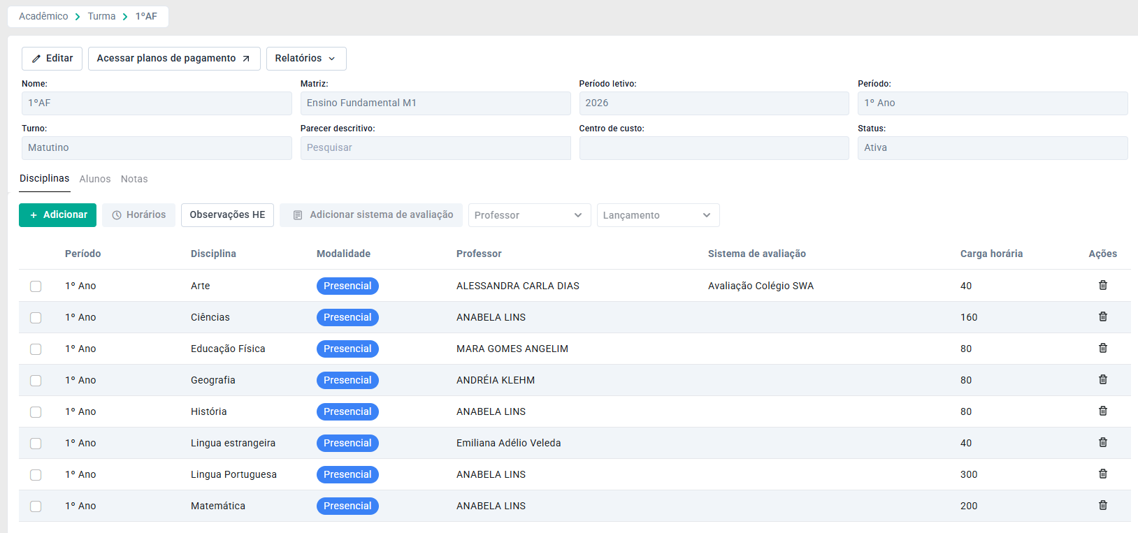 Assim, as disciplinas serão vinculadas a turma.