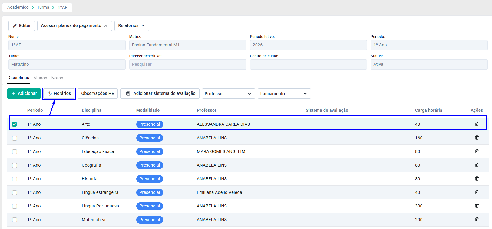 Selecione a disciplina e clique no botão Horários.