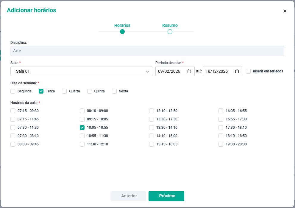 Essa tela funciona como um assistente no cadastro de horários, portanto selecione a Sala, informe a data início e término, selecione o dia da semana, e o(s) horário(s) a ser(em) inserido(s) e clique no botão Próximo.