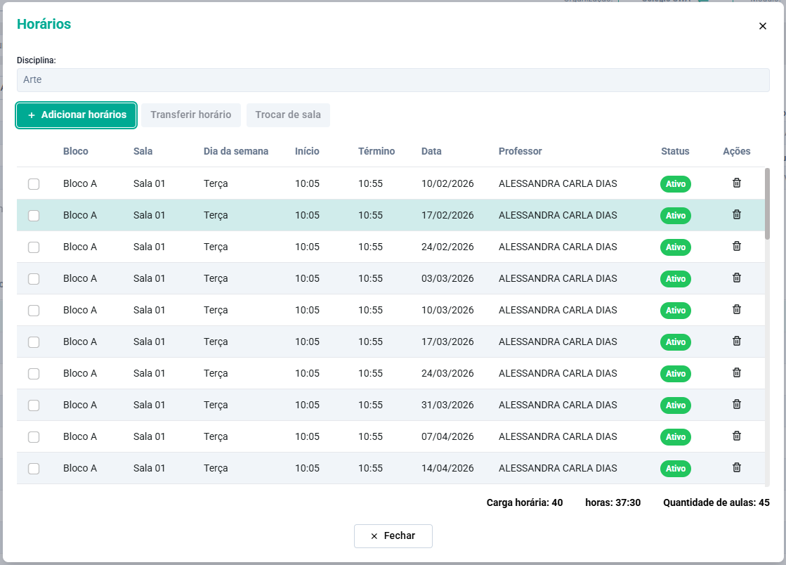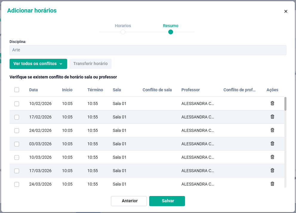 Na próxima etapa será apresentado um resumo dos horários. Caso tenham algum conflito de horário sala ou professor, é possível verificar e ajustar. Para finalizar clique no botão Salvar.