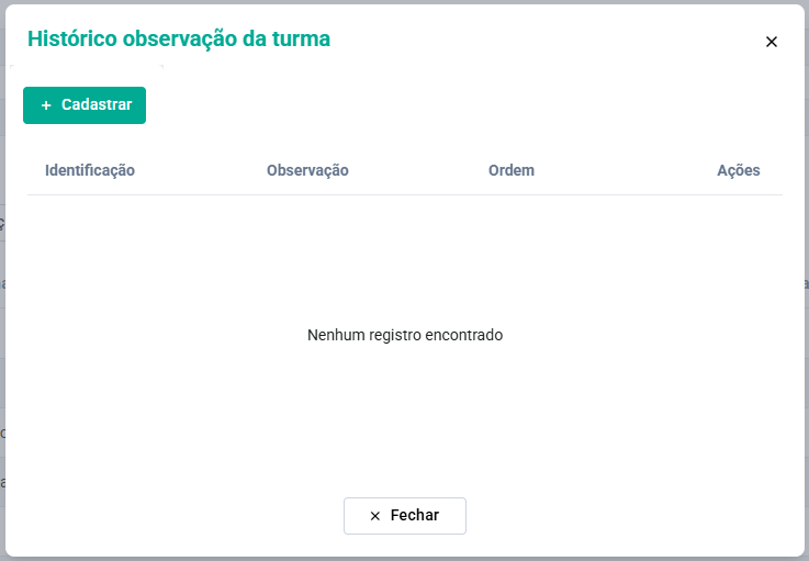 Na Tela de Histórico Observação Turma, clique no Botão Cadastrar.
