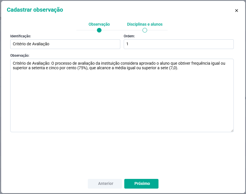 Informe uma Identificação, a ordem e o texto referente a observação e clique no botão Próximo.