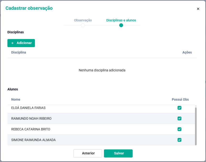 Caso seja necessário vincule a disciplina, e é possível marcar para quais alunos será apresentada a observação, após clique no Botão Salvar.