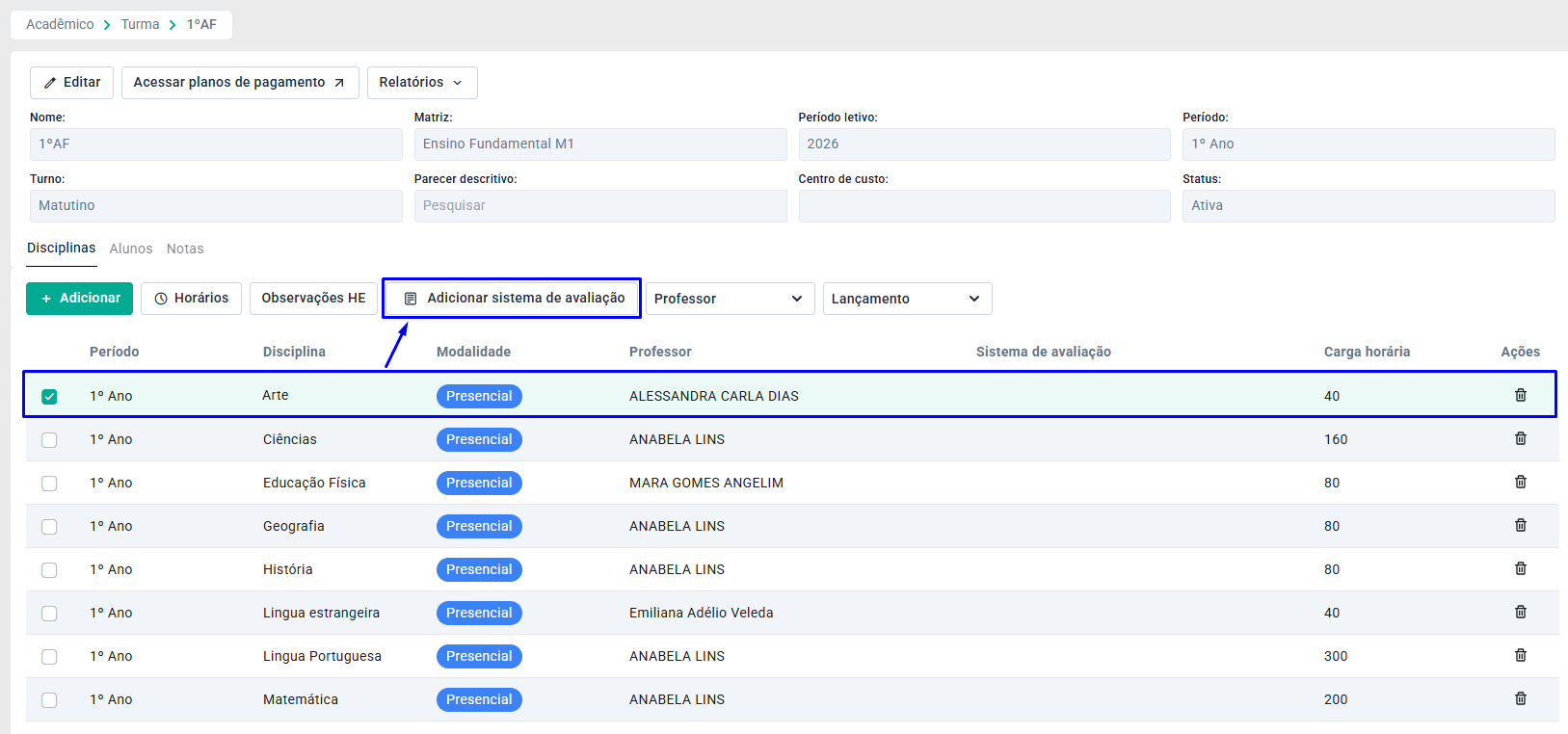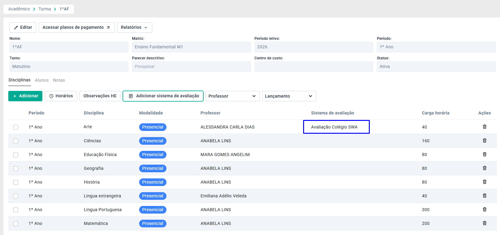 Assim, o sistema de avaliação será vinculado a disciplina da turma. Este procedimento deve ser realizado com o restante das disciplinas.