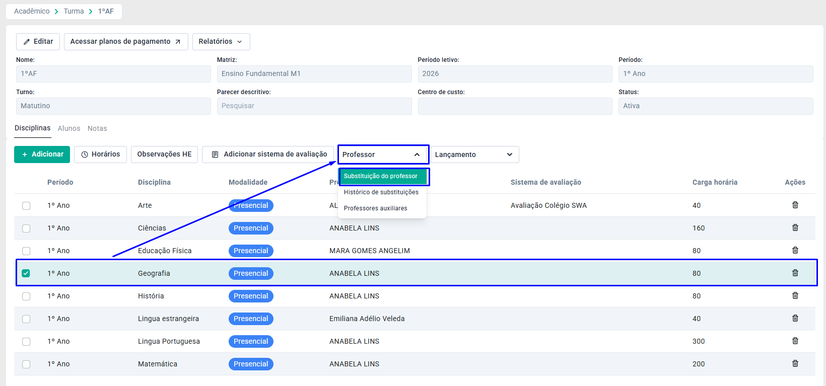 Selecione a disciplina e clique no Botão Professor e em Substituição do Professor.