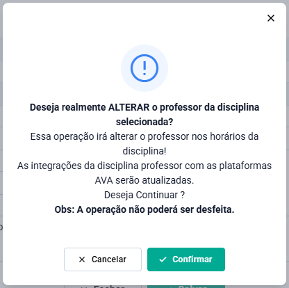 Após realizar esse procedimento, será apresentada uma mensagem se deseja alterar o professor da disciplina selecionada, para dar continuidade clique em Confirmar.