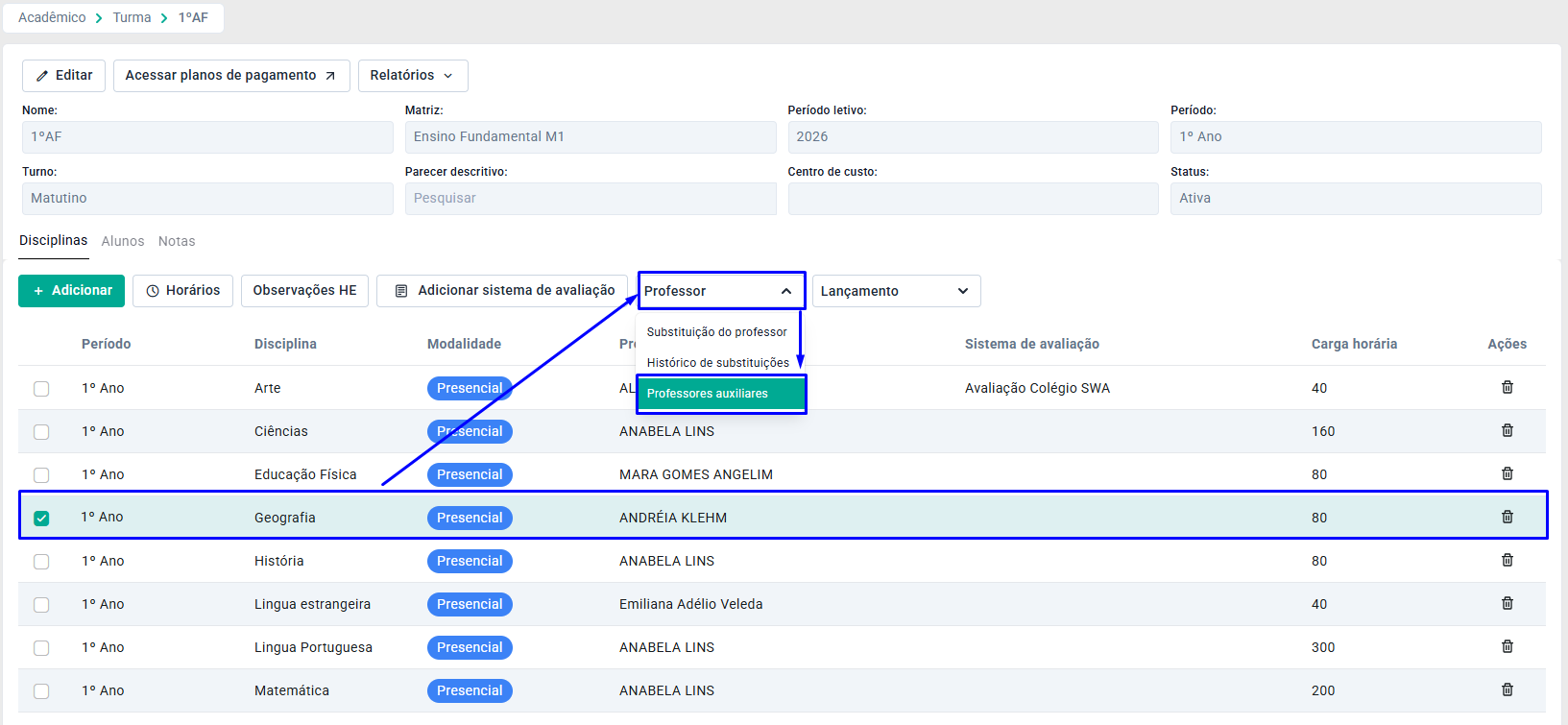 Para cadastrar o professor auxiliar, é necessário selecionar a disciplina e clicar em Professor e em Professores Auxiliares.
