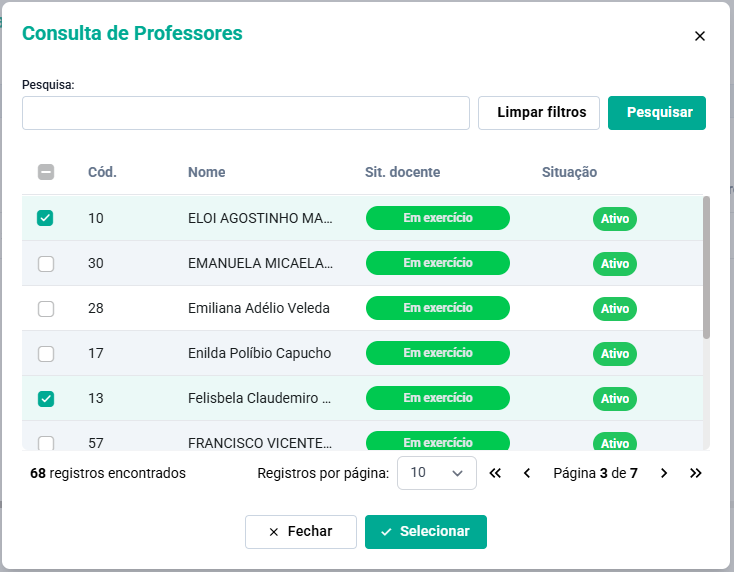 Na sequência será aberta a Tela de Consulta de Professores, selecione os professores desejados e clique no Botão Selecionar.