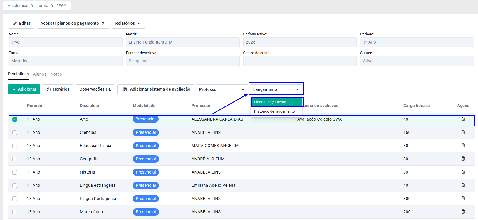 Para consultar as liberações, selecione a disciplina, clique no botão Lançamento e em Histórico de Lançamento.