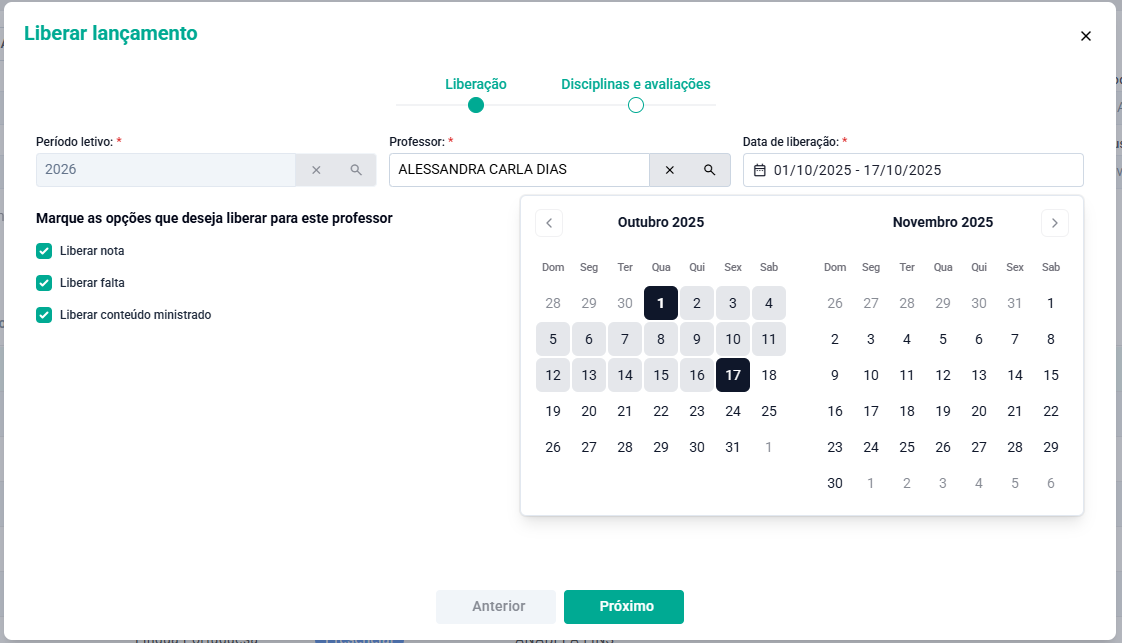 Na tela de Liberação de Lançamento, defina o intervalo de datas desejado e selecione as opções que deseja liberar, como notas, faltas ou conteúdos ministrado.