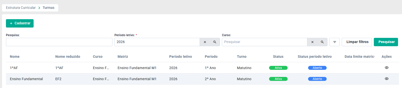 Para iniciar o cadastro de uma nova Turma clique no botão Cadastrar.