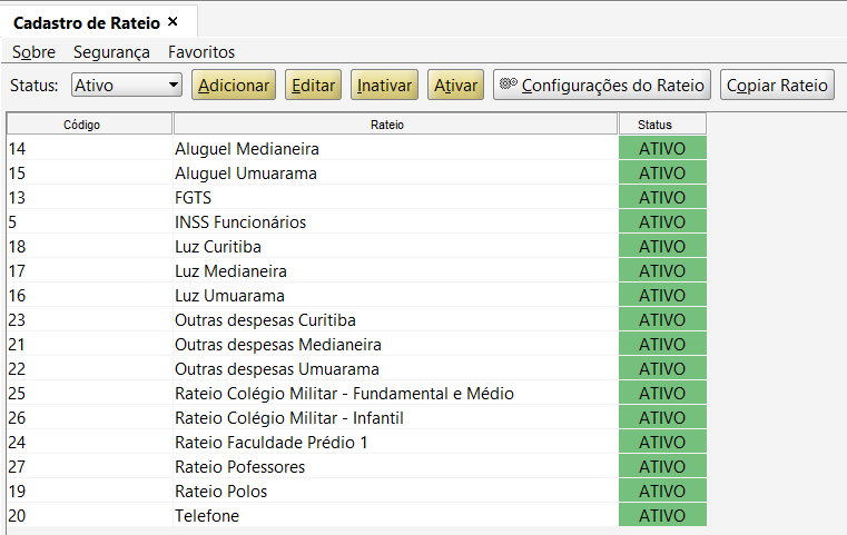 - Inativar/Ativar: Muda o status de algum rateio para Ativou e/ou para Inativo;