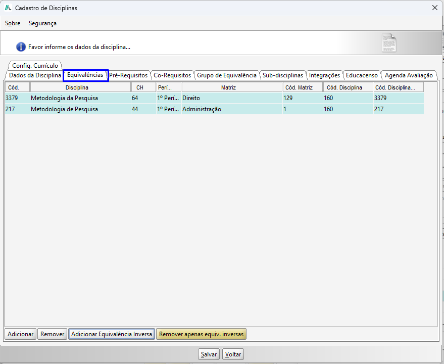 Equivalências: É necessário que as disciplinas possuam equivalências registradas entre si, permitindo o correto vínculo entre os grupos de aulas.