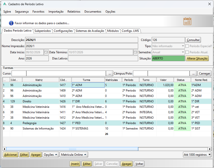 Ex: As turmas 1º ADM, 1º PED e 1º Dir, estão no mesmo período letivo.