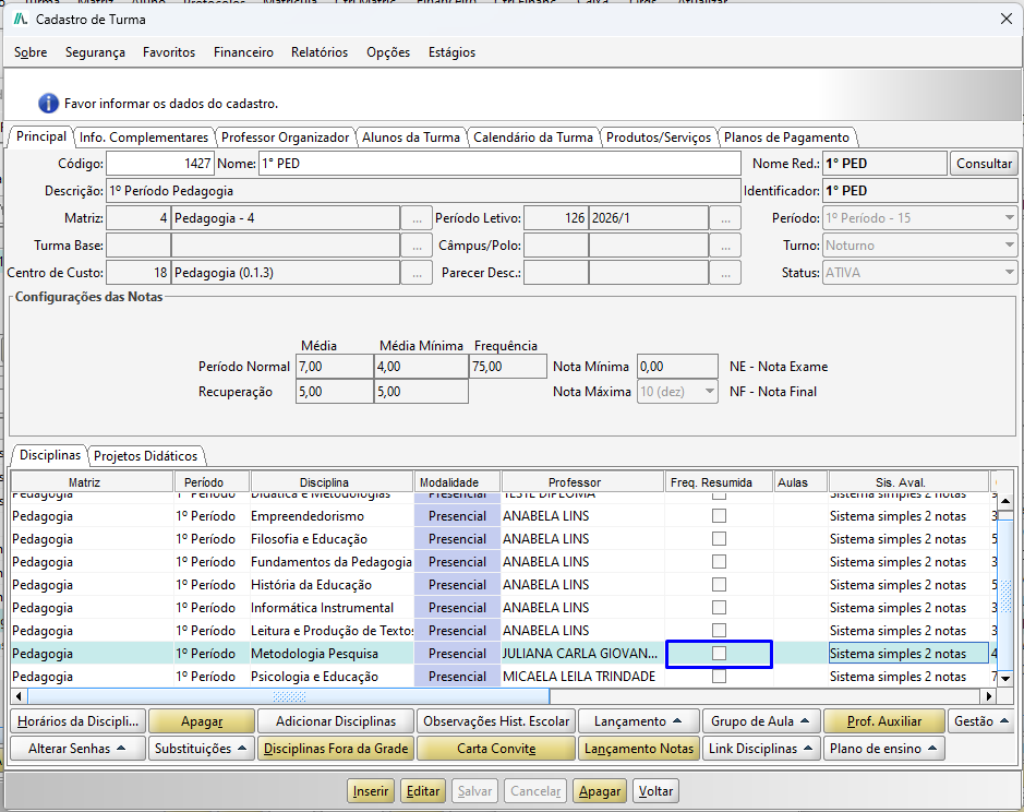 Ex: Todas as disciplinas de Metodologia de Pesquisa estão configuradas com o 'Sistema simples 2 notas'.