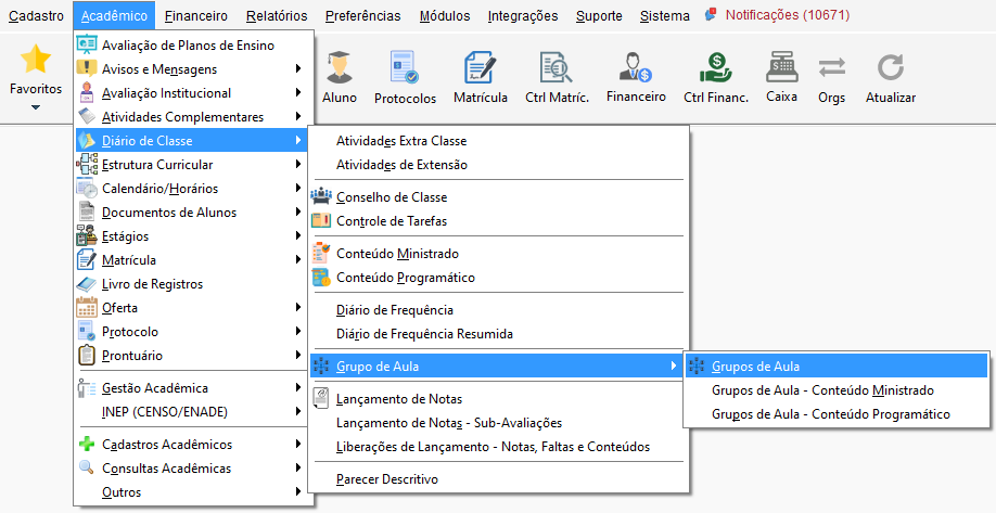 ACESSO A: Acesse o menu Acadêmico, navegue até Grupo de Aula e clique em Grupos de Aula.