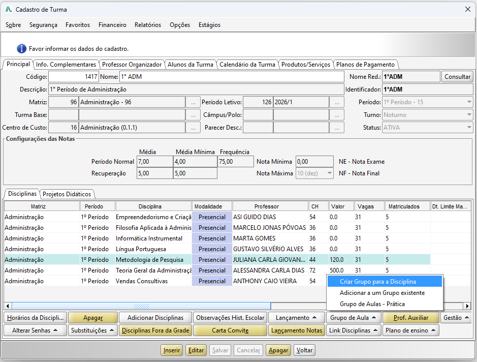 Disciplina: Definir qual será a disciplina base do grupo. É importante ser definido, pois será por meio desta disciplina, que será possível adicionar outras disciplinas no grupo de aulas;