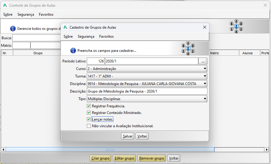 Na tela de Controle de Grupos de Aulas, clique no botão Criar Grupo.
