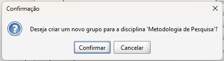 Será apresentada a mensagem de confirmação se deseja criar os horários para o grupo.