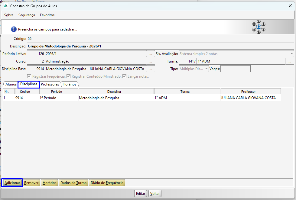 Na tela de Cadastro de Grupo de Aulas, clique na aba Disciplinas e no botão Adicionar.