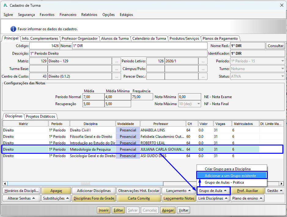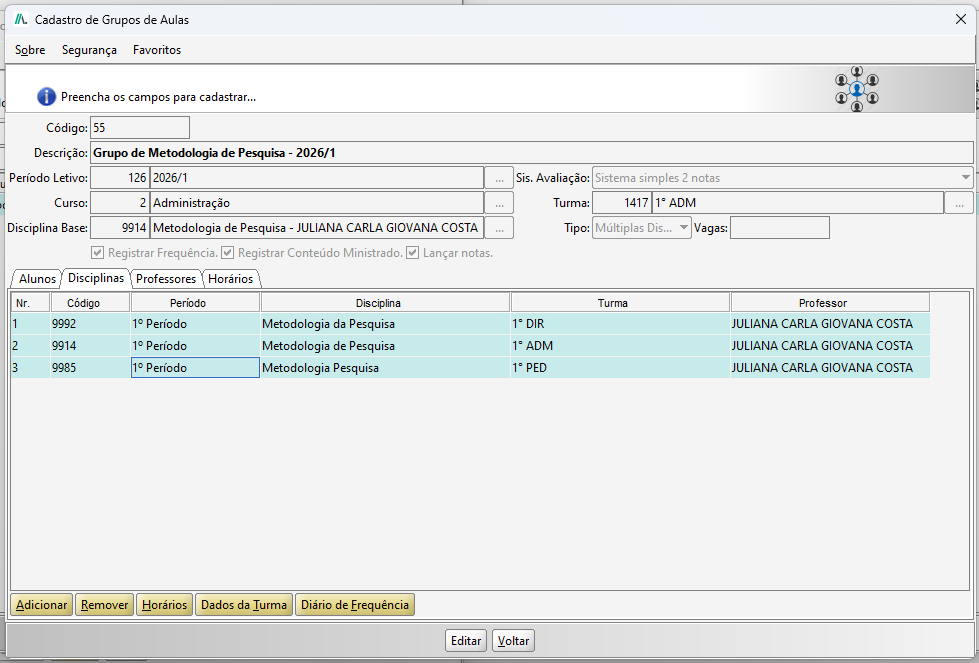 Para conferir se as disciplinas foram adicionadas com sucesso, é só ir na tela Cadastro de Grupo de Aulas e na aba Disciplinas e verificar se estão se estão sendo apresentadas juntamente com a disciplina base.