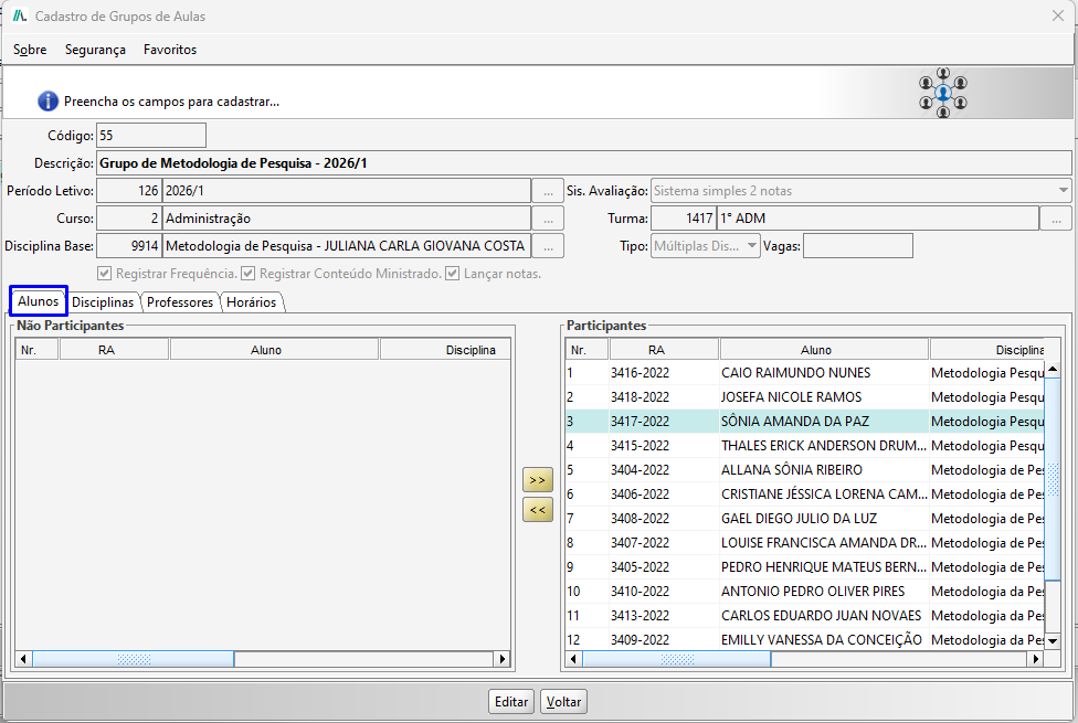 Na tela Cadastro de Grupos de Aulas, clique na aba Alunos.