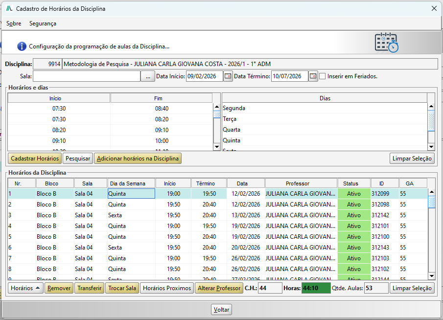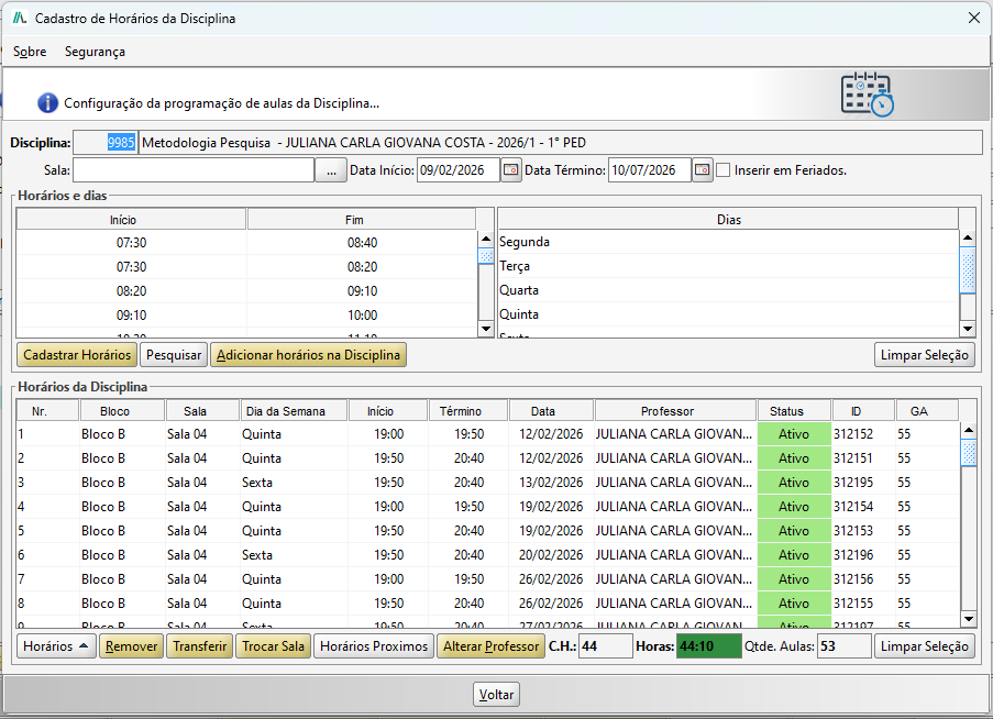 Será registrado os horários para as disciplinas. Para confirmar se o procedimento foi bem sucedido, vá na aba Disciplinas , selecione a disciplina e clique no botão Horários.