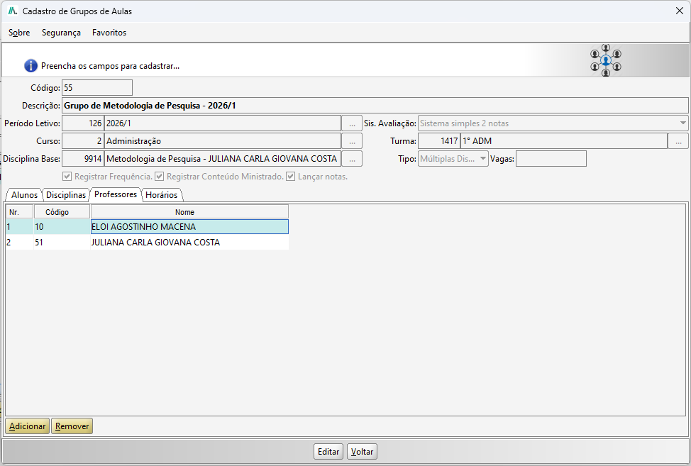 Por padrão, ao ser criado o grupo de aulas, automaticamente o professor responsável da disciplina base já será vinculado no grupo.