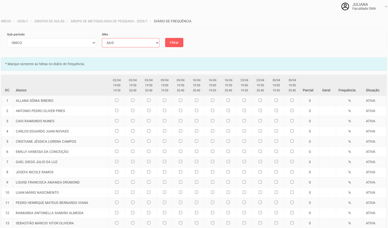 Assim, estará disponível para o professor realizar o lançamento da frequência dos alunos.