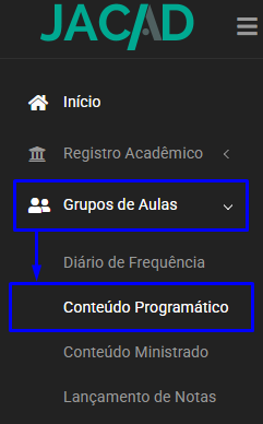 Acesse o menu Grupo de Aulas e clique em Conteúdo Programático.
