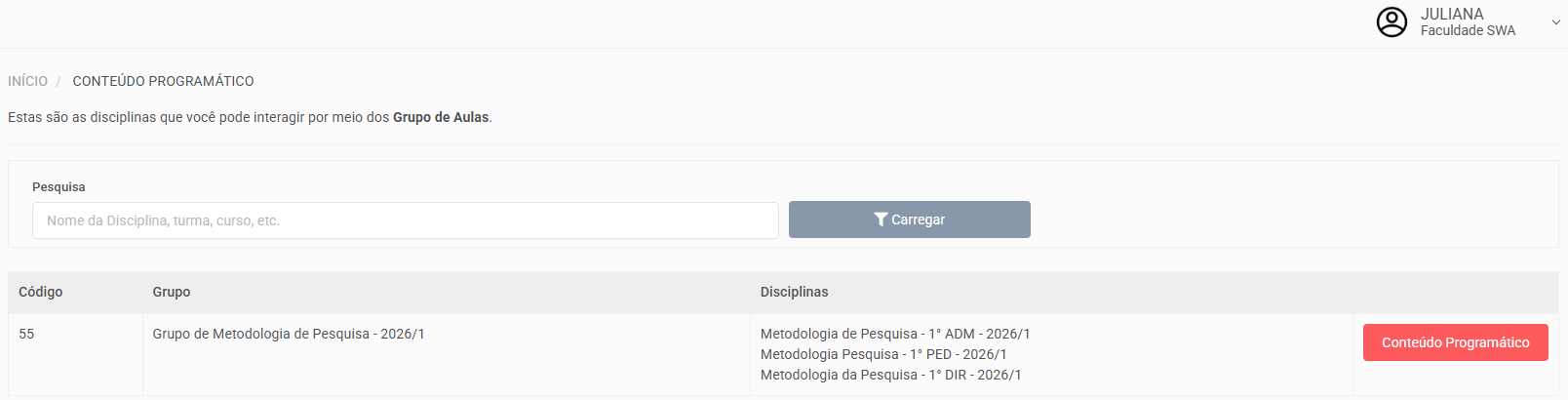 Será apresentado o grupo de aula e as respectivas disciplinas vinculadas ao grupo, para acessar clique no botão Conteúdo Programático.