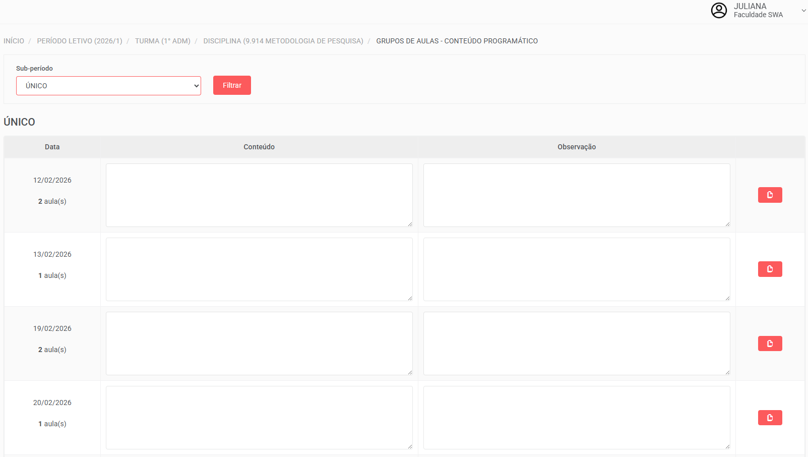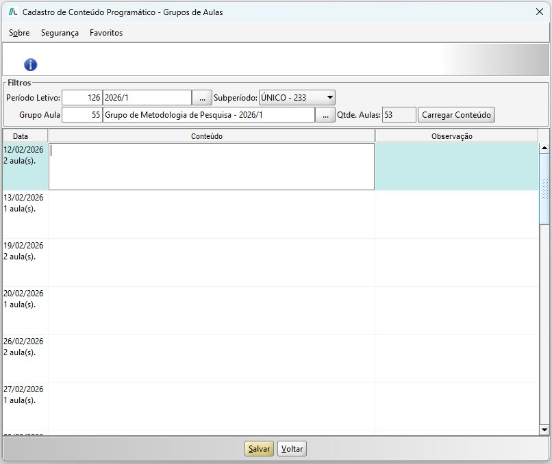Assim, estará disponível para o professor realizar o lançamento do conteúdo programático.